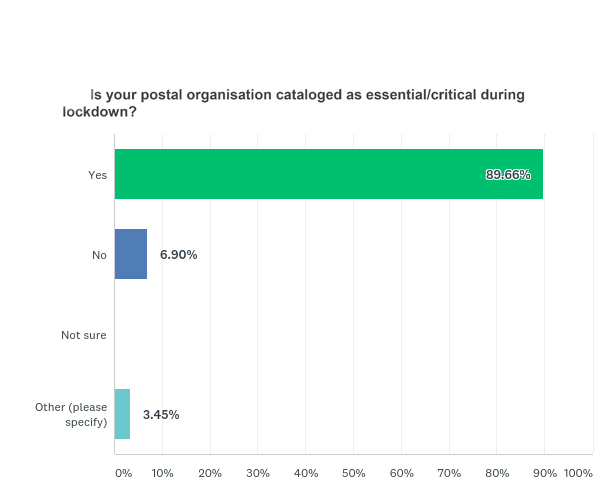 Nearly all countries surveyed were experiencing either a complete or partial lockdown with restrictions in place to contain the spread of the virus. In these circumstances 90% of posts were recognized as providing essential services and, in most cases, postal staff identified as key workers.