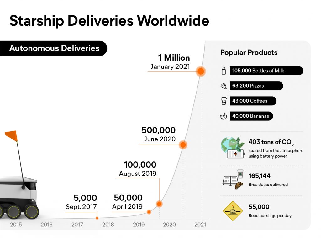 “Completing one million deliveries is a milestone that everyone at Starship is celebrating,” said Ahti Heinla, co-founder and CEO of Starship Technologies. “We are delivering a fully commercial service operating 24/7 across five different countries now, doing thousands of deliveries a day and millions of autonomous miles per year. This scale puts Starship on a par with the biggest companies in the self-driving car market when it comes to miles traveled in the last year alone. We’re proud to be offering a crucial service that is now becoming part of everyday life for millions of people.”